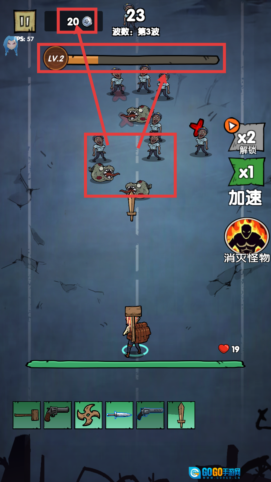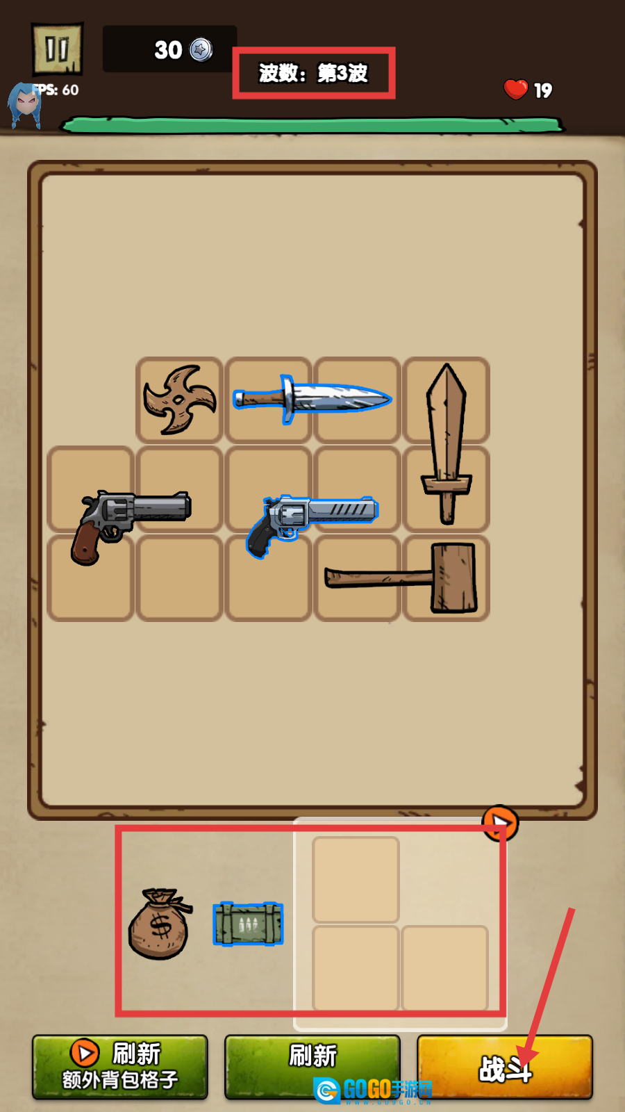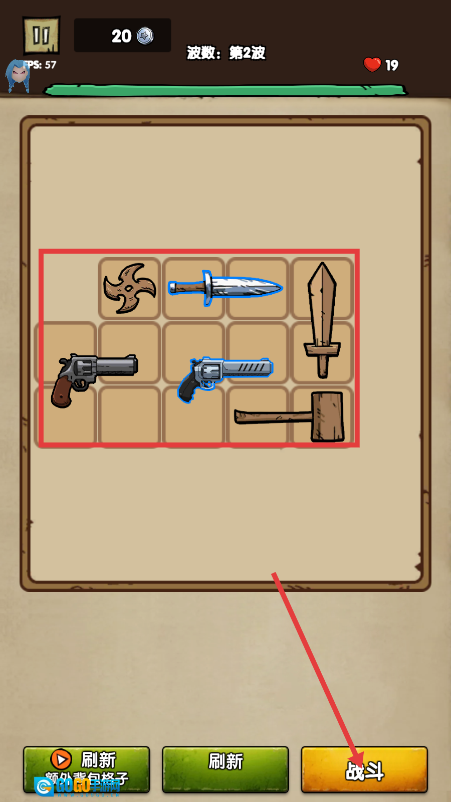 1、武器栏中有多种武器,点击【战斗】按钮,进入第2波战斗,继续推进关卡。