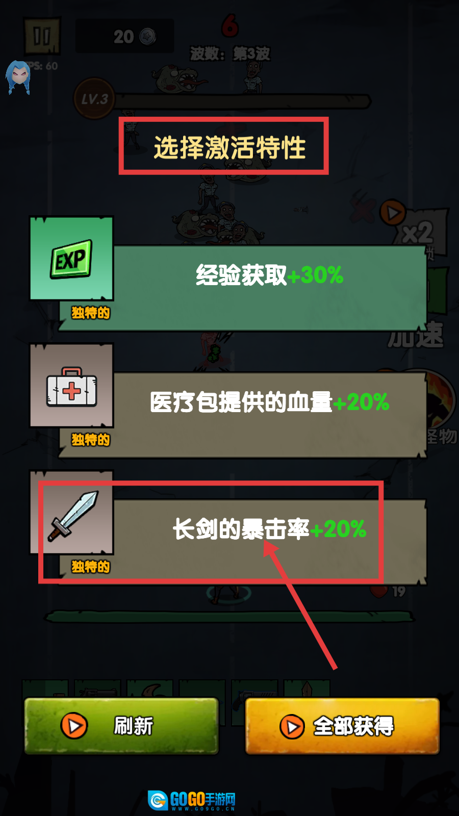 3、选择激活特性时,优先选【长剑的暴击率+20%】,增强长剑伤害,助力后续战斗。