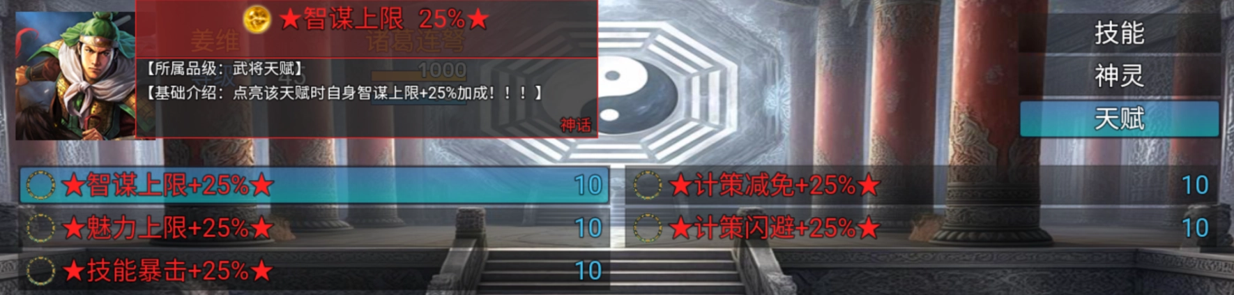 4、天赋:智谋上限+25%计策减免+25%魅力上限+25%计策闪避+25%技能暴击+25%