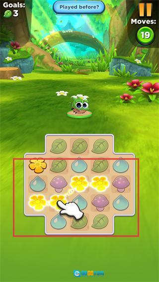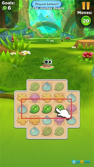 2、按照提示拖动相同的图案(例如绿叶)来完成消除操作,当前关卡的目标是消除6个指定元素,还剩下20步可以使用。