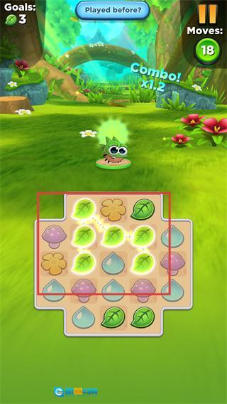 3、滑动屏幕,让三个及以上相同的图案连成一条线,就能触发消除效果;消除图案时会对鼻涕虫造成伤害,同时还能收集树叶。