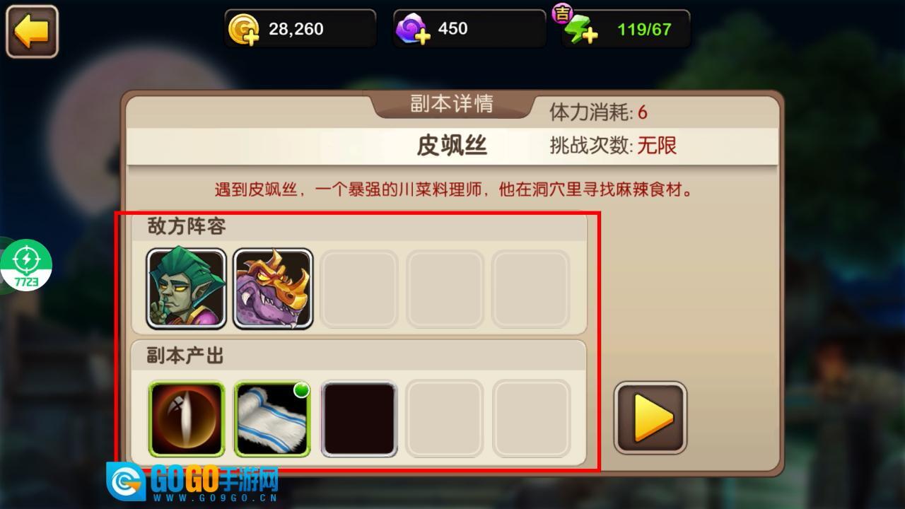2、进入副本前查看【敌方阵容】与【副本产出】,了解对手配置和奖励道具,提前规划应对策略以高效通关。