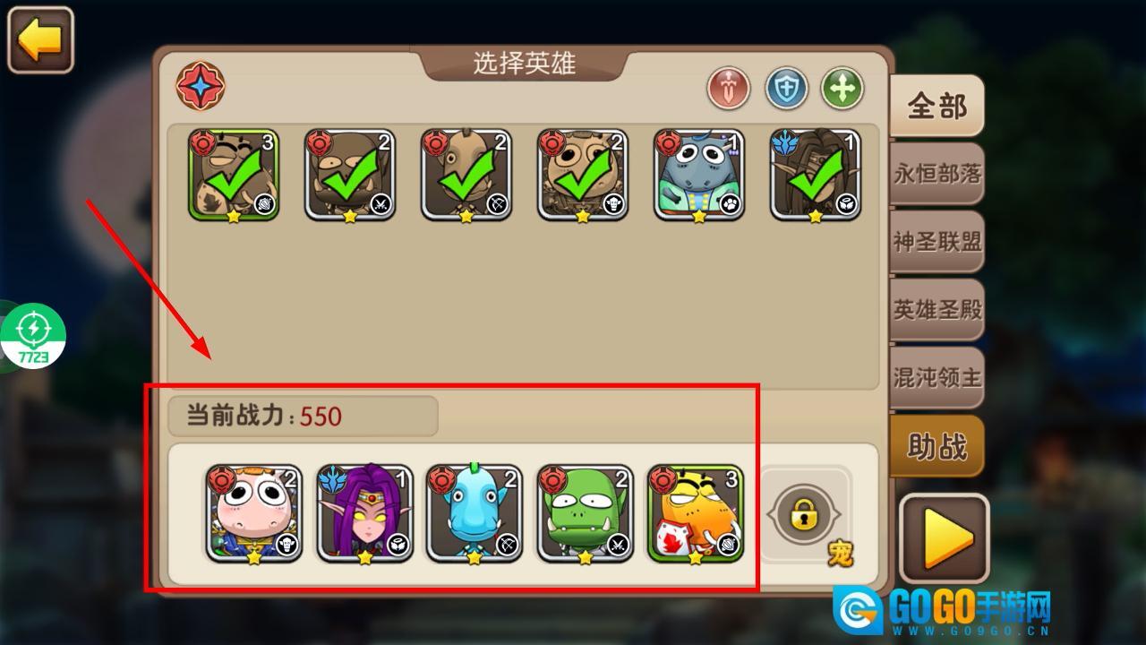 3、选择英雄时关注【当前战力】数值,搭配不同阵营英雄组成强力队伍,提升战力以便顺利挑战副本。