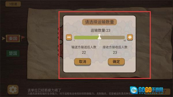 3、在运输界面选择【23】兵力输送功能,合理调配【输送方】与【接收方】的兵力人数,通过增强前线接收方的战力来有效应对敌方的攻势。