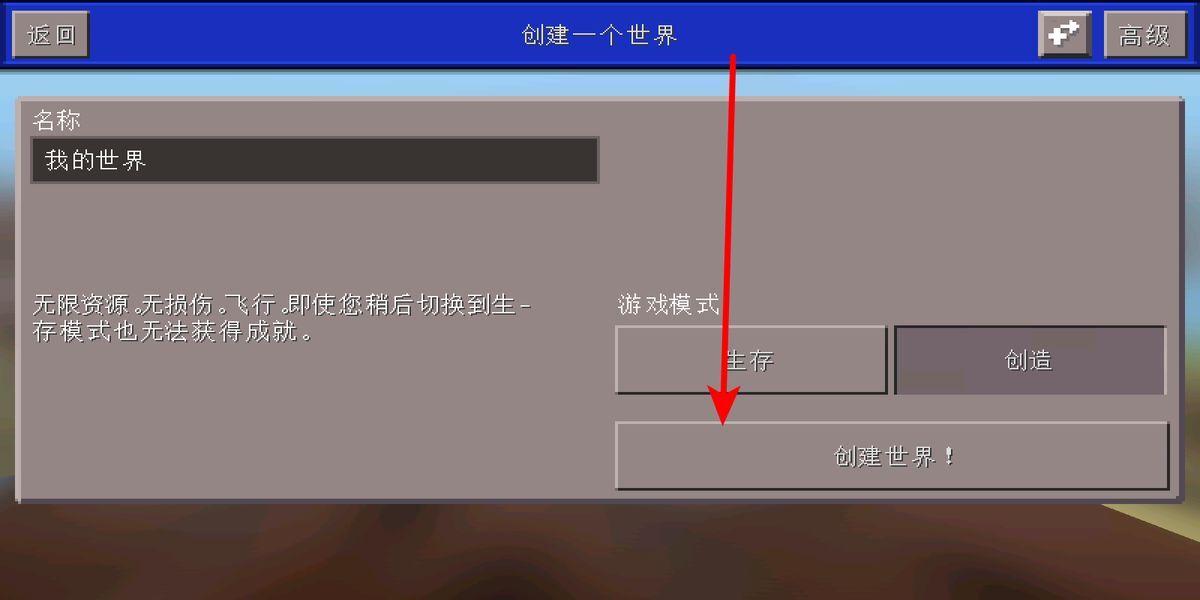 2、进入创建世界的界面后,你可以为这个世界起一个独特的名字,同时还能选择游戏模式——目前有生存和创造两种模式可供挑选。选好这些设置后,只需点击创建世界按钮,就能生成专属于你的世界,开启一段充满探索与建造乐趣的旅程。