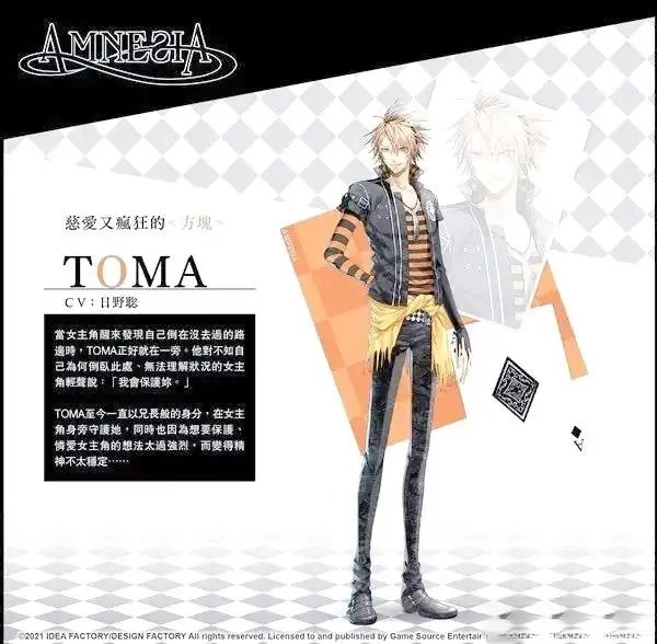 当女主角在陌生的路边醒来,发现自己身处困境时,TOMA恰好出现在她身旁。他轻声地安慰她,告诉她他会保护她。TOMA一直扮演着兄长般的角色,默默守护在女主角身边,然而,由于他强烈的保护欲和爱意,他的情绪变得有些不稳定。