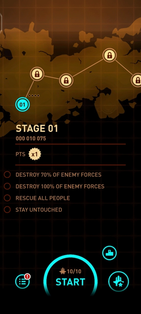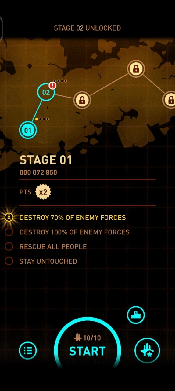 1、启动游戏,点击“START”按钮进入游戏,各关卡的目标信息在游戏首页均有展示。