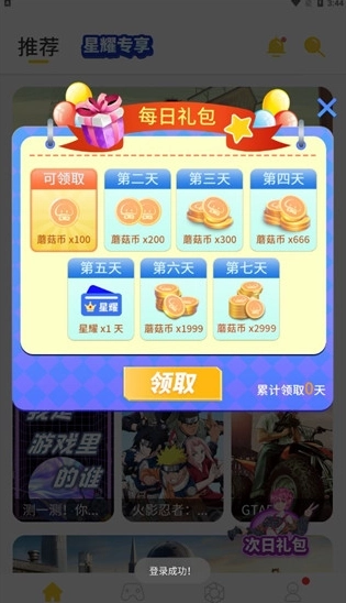 2、登录进入主页,接口领取对应的蘑菇币奖励。