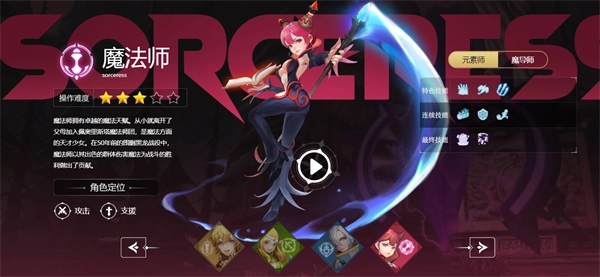 特点:凭借强劲的远程输出能力与多样的元素魔法闻名,借助宝珠和魔法书展开战斗,具备广域攻击技能与强效控制魔法,不过生命值偏低,操作难度较大。