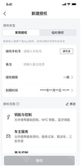 3.填写被授权人注册时使用的手机号码,根据需求选择授权期限以及授权范围(涵盖钥匙与控制、车主服务、更多控制、隐私功能等选项,可按需勾选),点击确定并通过相应验证后,授权流程即完成。