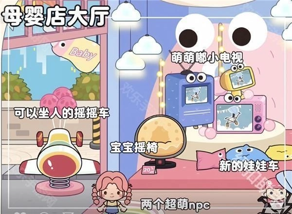 1、母婴店大厅里,红白相间的摇摇车色彩明快,让人看着就心生欢喜;萌萌的小电视、崭新的娃娃车和宝宝摇椅错落摆放,还有两个软萌可爱的NPC,处处透着温馨可爱的氛围。