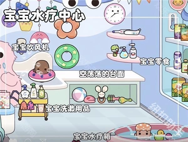 2、宝宝水疗中心:配备宝宝专用吹风机,以及云朵、花朵、星星等多种形状的宝宝游泳圈,还提供宝宝洗刷用品、宝宝零食和宝宝水疗箱。