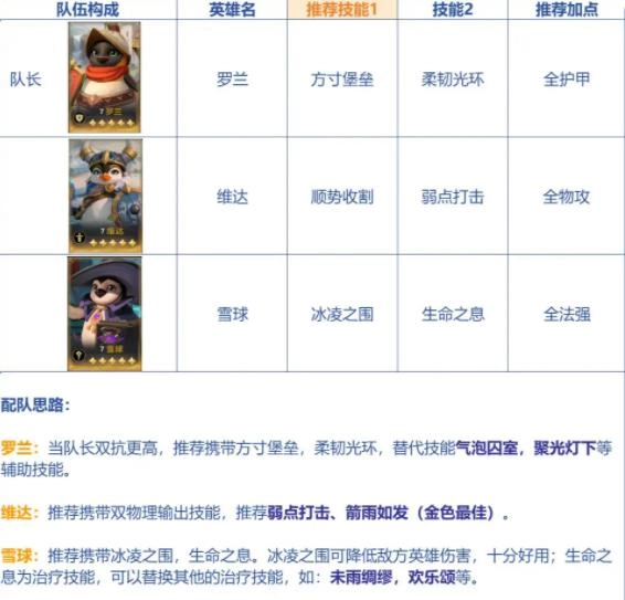 1、罗兰、维达、雪球这三小只之间存在羁绊效果,能让它们受到的普通攻击伤害减少8%,在前期开荒阶段使用起来特别顺手。