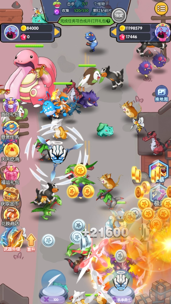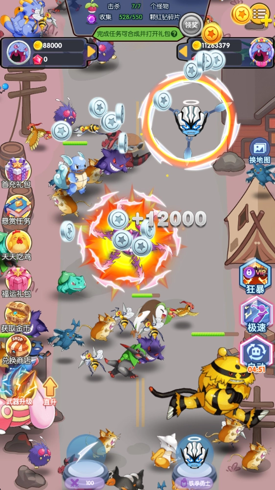 1、右侧还设有极速、狂暴等可开启的功能,能在短时间内为你提升战斗力,助力你更畅快地消灭来袭的敌人。