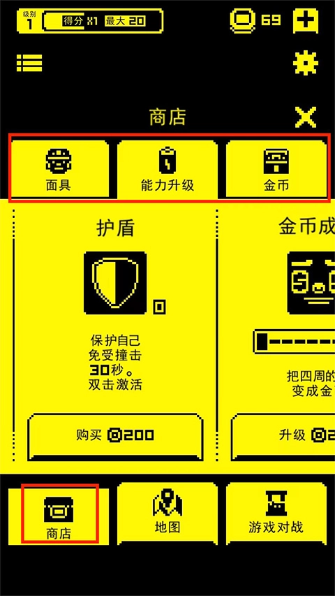 7、进入商店界面,可进行面具、能力升级以及金币的购买操作。