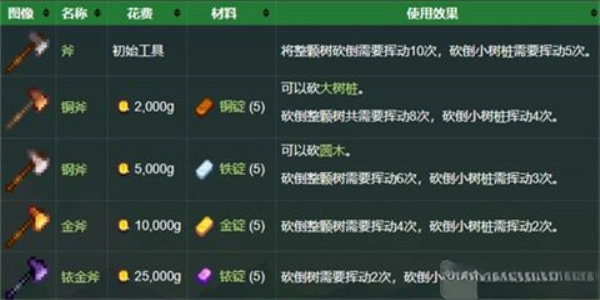 可用于砍伐树木获取木材与树液,还能从大树桩或圆木里收集硬木。