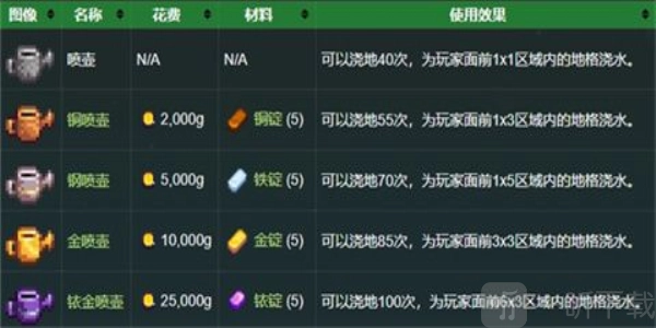 它能用来浇灌作物,可盛装各类水源,也能汲取井水。要是一天没给作物浇水,它们的生长就会变慢,严重时甚至会枯萎。不过要是遇到下雨天,就不用特意去浇水了。