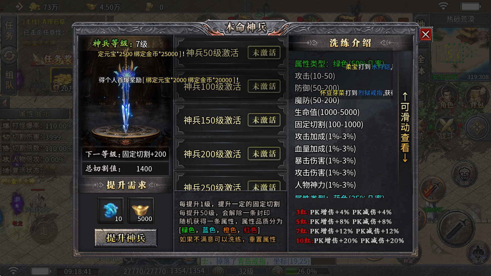 1、本服务器的神兵系统:通过消耗天玄晶与元宝来提升等级,每提升1级,可增加固定数值的切割伤害;每提升50级,则会解锁一条封印属性。