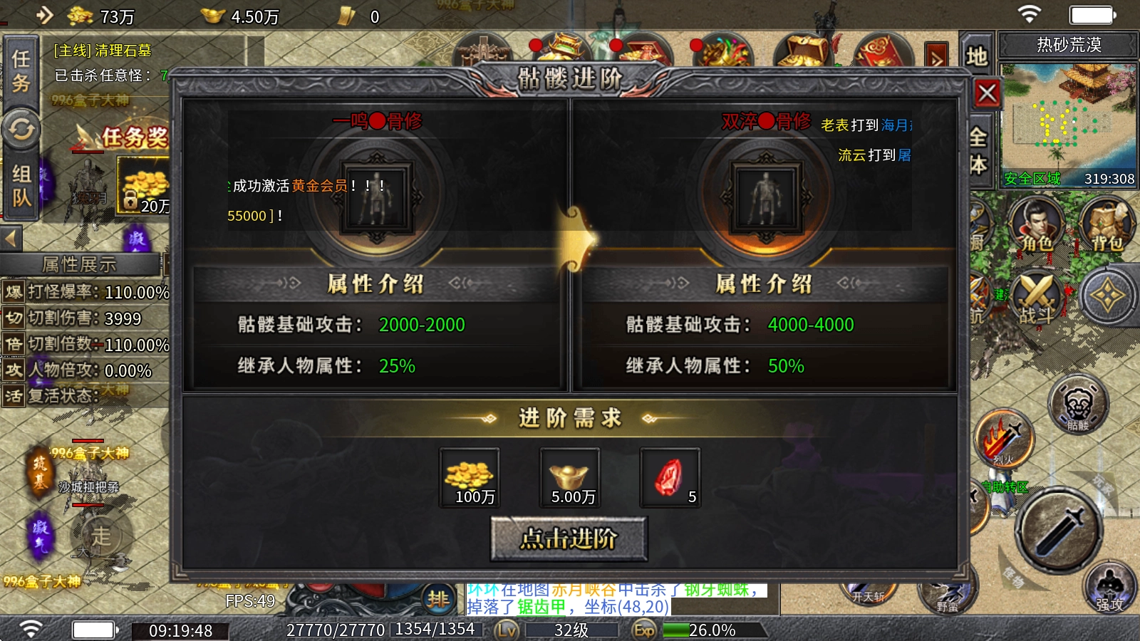 2、骷髅进阶:需消耗足量的金币、元宝与传承魂石来完成进阶操作,每次进阶不仅能带来高额的攻击加成,还会提升继承人物属性的百分比。
