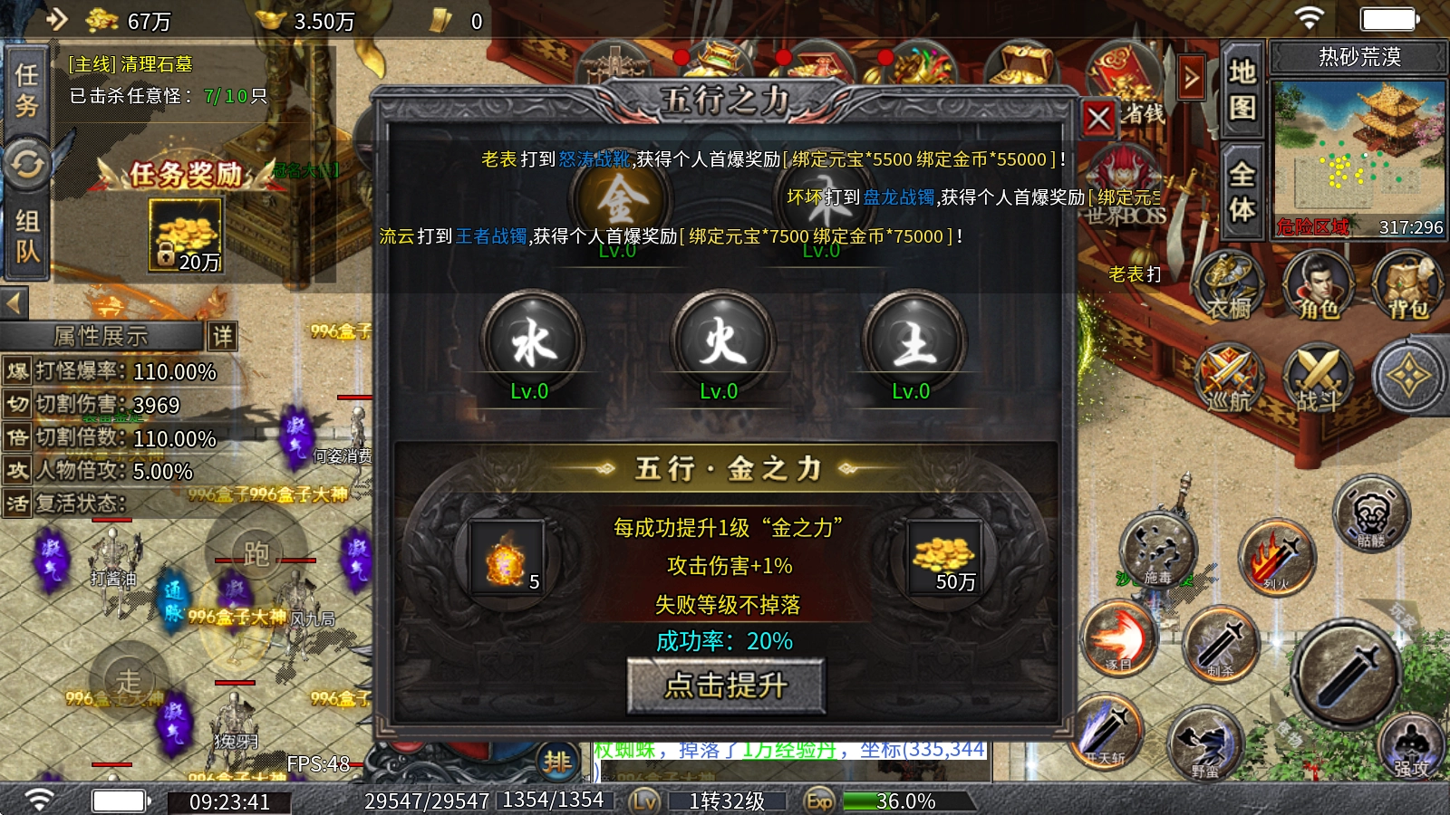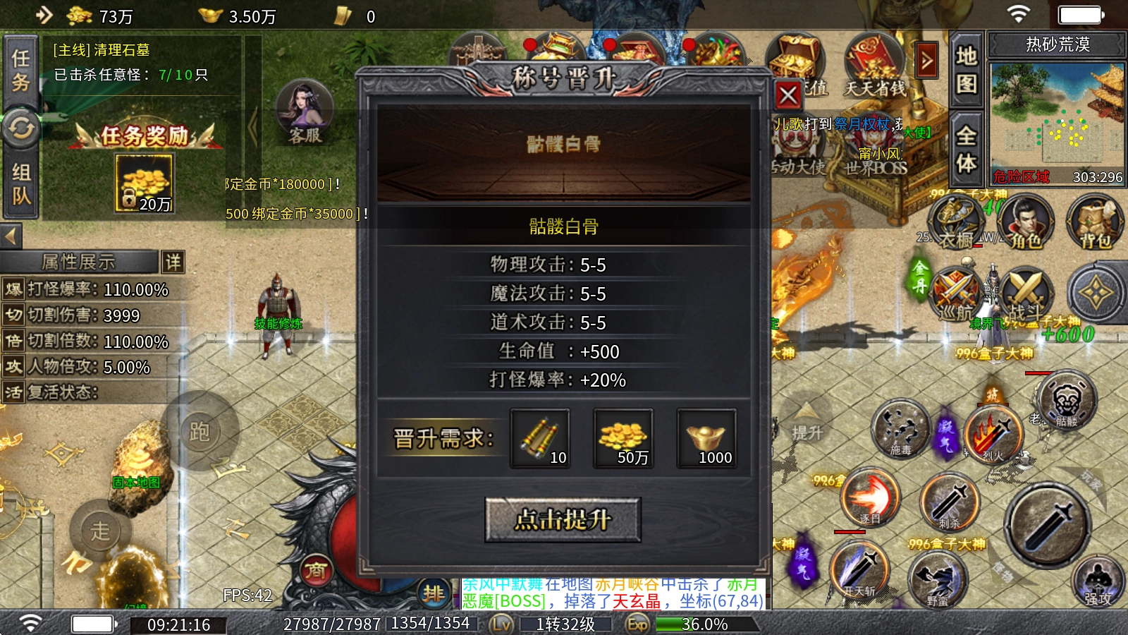 3、称号晋升:通过消耗称号碎片、金币与元宝来实现提升,每提升一级不仅会增强攻魔道属性,更关键的是能提高打怪的爆率!