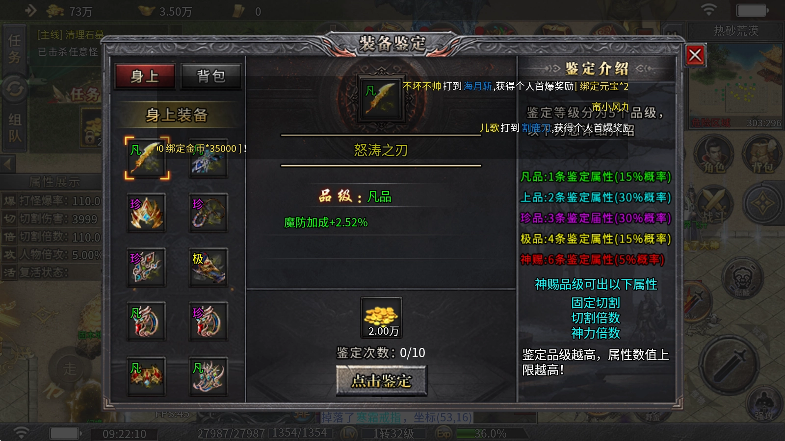 4、装备鉴定:消耗金币就能对装备展开鉴定,鉴定等级划分为凡品、上品、珍品、极品与神赐五类,鉴定品级等级越靠前(从凡品到神赐),属性数值上限就越高。