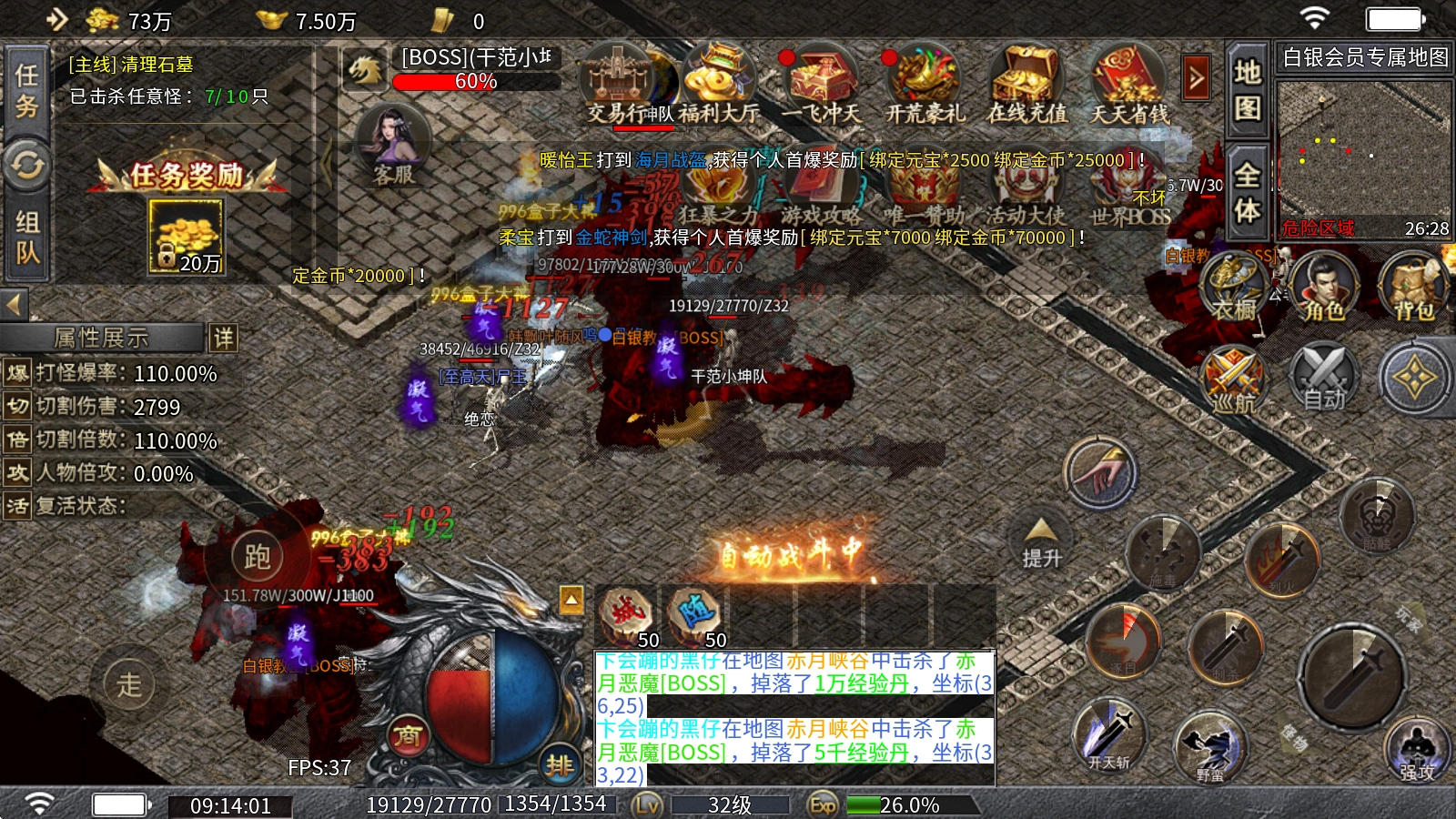 2、海量地图可供自由探索,众多BOSS等待你来挑战击杀,成功击败BOSS即可获得属性奖励!更有镇妖塔玩法助力你寻觅超强背包神器!
