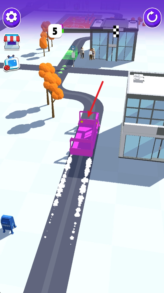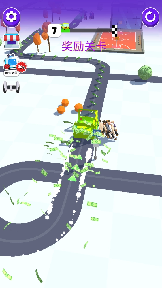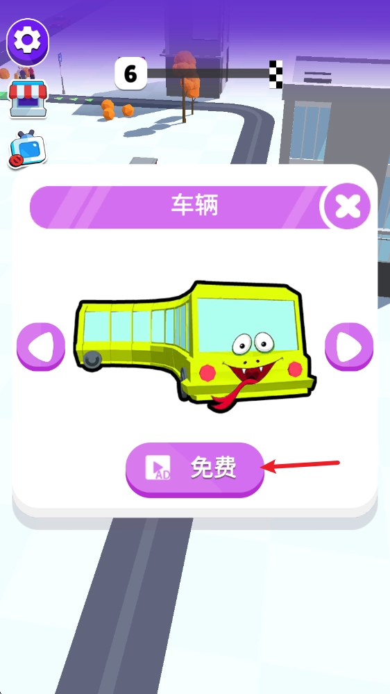 解锁后,在关卡开始前,点击左侧的汽车图标,在这里可以通过观看广告获取新车。