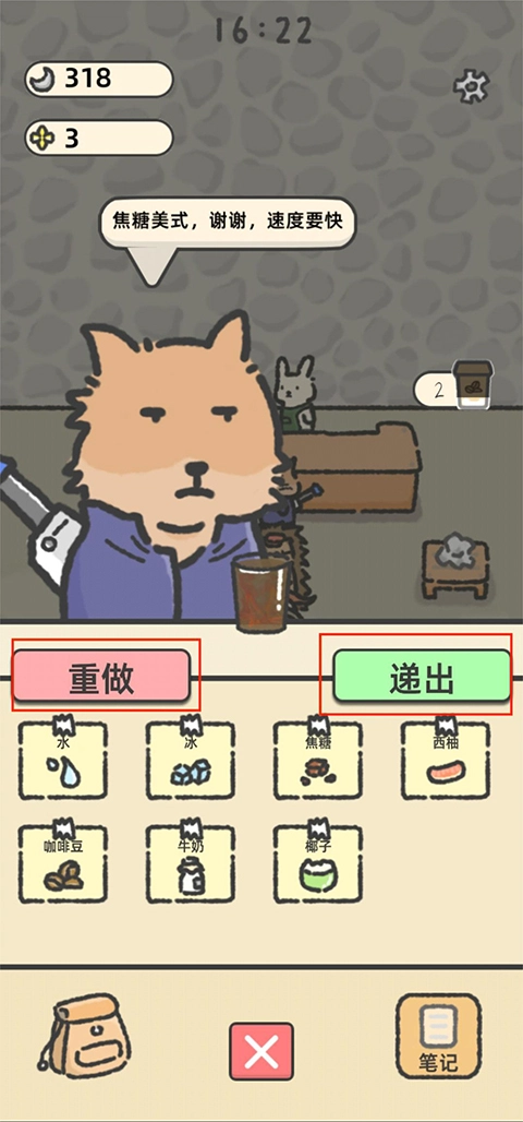 3、制作完成后,点击“递出”按钮即可;若饮品制作有误,点击“重做”可返回重新制作饮品。