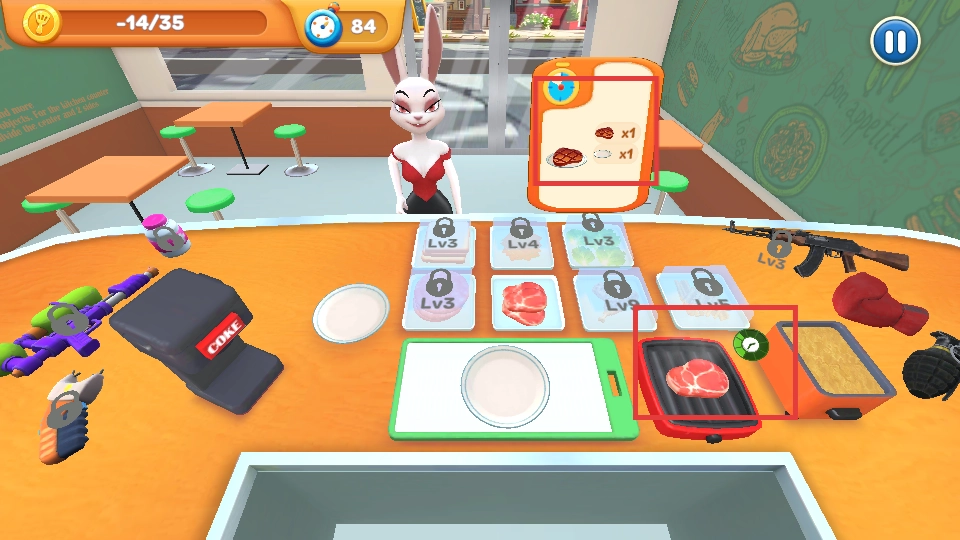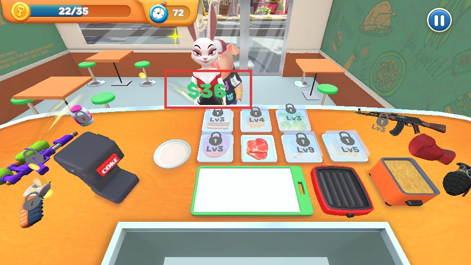1、快节奏的玩法需要用户快速完成烹饪相关的任务,像翻转汉堡、切割蔬菜等,并且还要应对顾客的捣乱行为,而时间上的限制则进一步增强了游戏的紧张氛围。