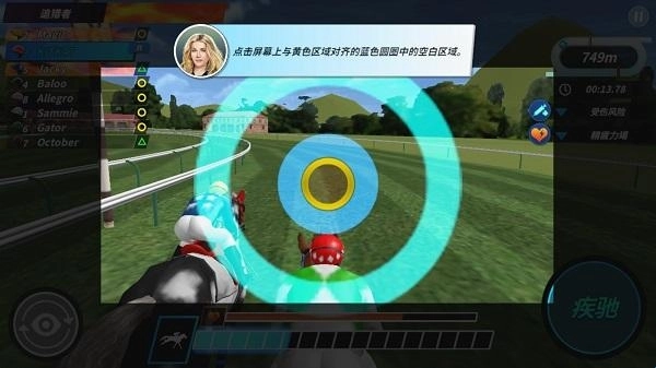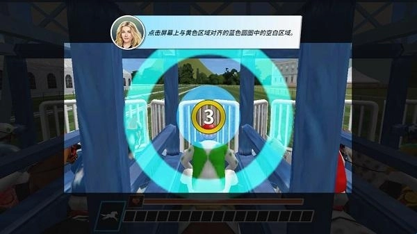 2、比赛过程中,你会进入一个需要和马保持同步的阶段。请点击屏幕上与黄色区域对齐的蓝色圆圈内的空白部分。