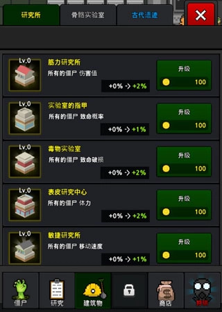 4、可追加病毒研究项目,增加僵尸的类型与可容纳数量;其次,对研究所、实验室进行升级改造,开发古代遗迹相关内容,以此提升所有僵尸的能力。