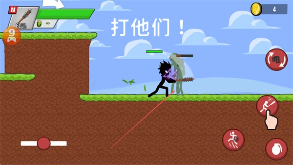 1、点击右侧的攻击按钮,控制火柴人对僵尸发起攻击,通过消灭敌人来获取金币。