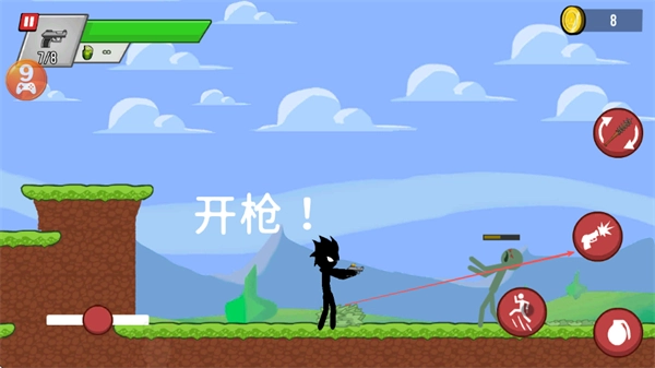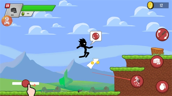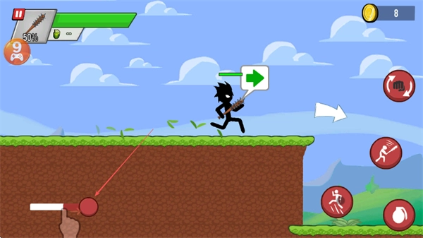 2、滑动左侧的摇杆,操控火柴人朝右移动,探索周边地形,搜寻新出现的敌人与可利用的资源。