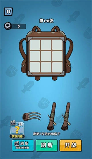 2、把初始武器拖到背包格子里,相同的武器能够合并升级,只要点击“刷新”就能得到新武器。