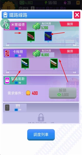 3、解锁铁路线路并调度列车,提升车站的客运效益,增加经营收益。