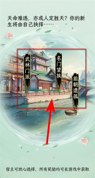 1、进入初始选择界面后,点击目标势力选项如武林门派,选定角色的出身背景,开启剧情流程。