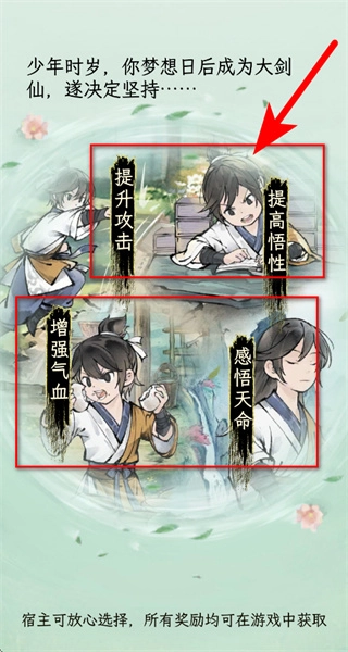 2、在属性成长界面,点击对应选项如提高悟性,为角色选定初始成长方向,奠定属性基础。