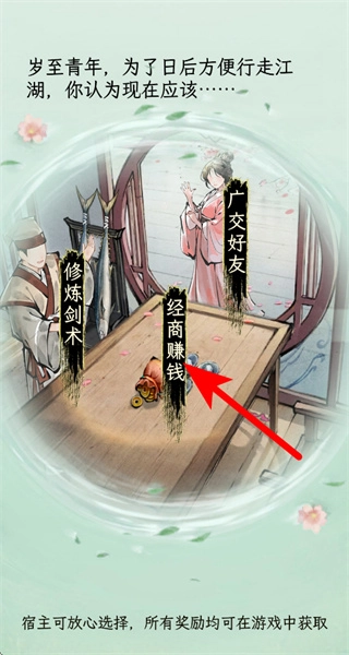 4、在青年阶段选择界面,点击发展方向选项如经商赚钱,决定角色的中期成长路径,推进进程。