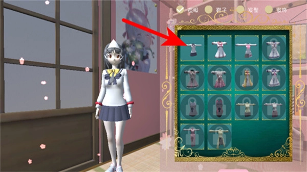 2、切换到衣服分类栏,选择心仪的服装样式如第二件连衣裙,为角色更换穿搭造型。