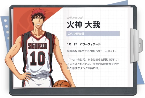 从美国回到日本的他和第一主人公黑子哲也是搭档,是遇见命运之影的真正光芒,也是诚凛高校的新生王牌。