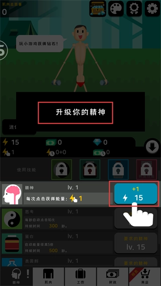 3、消耗能量点击【+1】-【15】按钮升级精神,提升每次点击能量获取量,加速肌肉养成节奏。