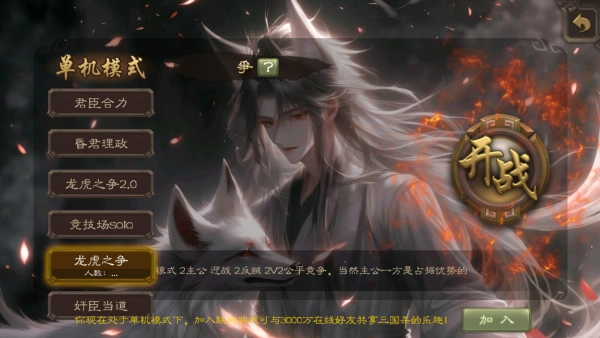 3、游戏君臣之力、昏君理政、龙虎之争2.0、竞技场solo等多种玩法,均为单机模式,无需联网就能畅玩。