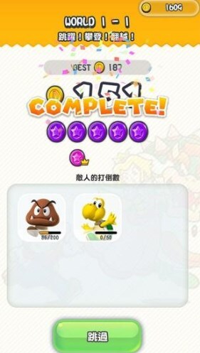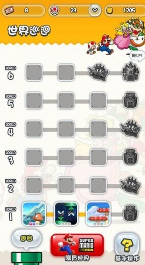 游戏开场的引导依旧以库巴掳走碧奇公主为起点,后续的教学环节会让玩家明白,在《超级马里奥跑酷》里马里奥是自动向前移动的,遇到低矮障碍或普通敌人时,我们甚至无需任何操作就能轻松越过它们。另外要留意的是,当马里奥跨越小型敌人的瞬间点击屏幕,就能完成大跳并在空中做出华丽动作。至于其他操作方面,其实和常规跑酷游戏是相同的。