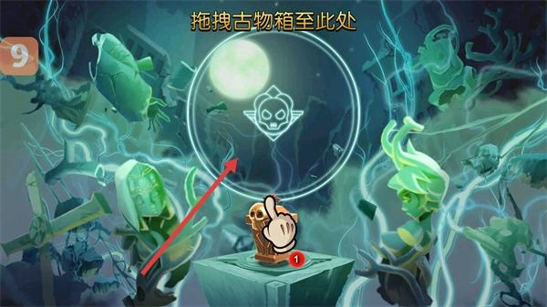 4、按照【拖拽古物箱至此处】的提示,将古物箱拖动到指定区域,即可达成该交互类任务的目标。