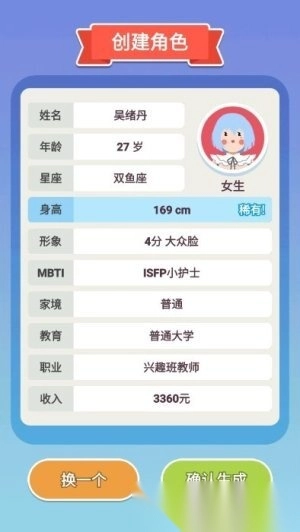 在选择好性别选项后,系统会自动生成一个随机角色形象。玩家可以根据自己的喜好,多次切换不同的角色形象,直到找到满意的为止;也可以直接点击确认按钮,确定当前生成的角色形象。
