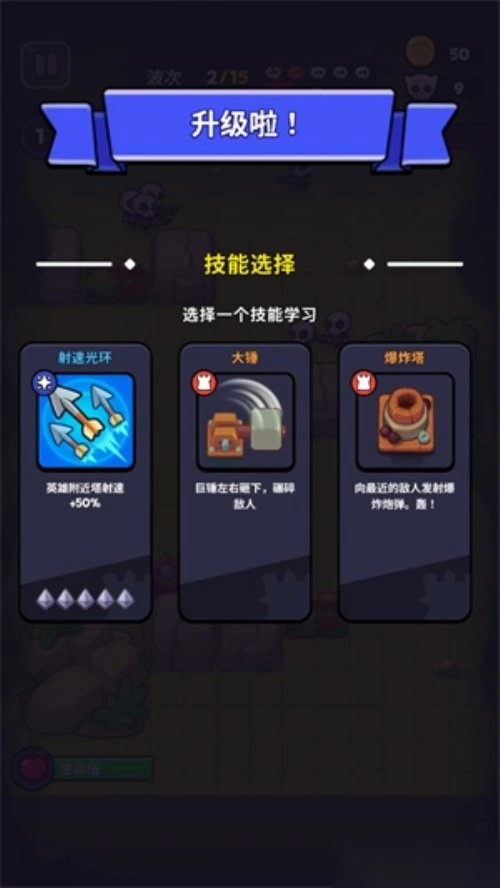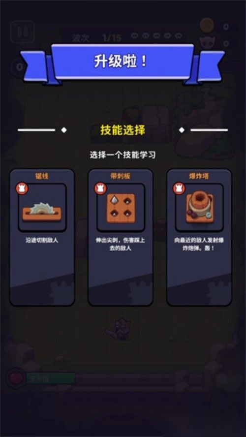 击败敌人能获取经验,等级提升后可以挑选一个技能或者一座炮塔。