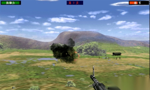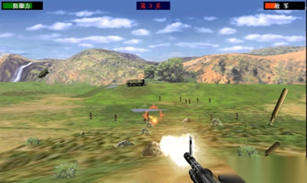 3. 用机枪攻击士兵。要是没能摧毁运兵战车或运兵飞机,就会有大批士兵出现,进入射击范围对你发起攻击,特别是扔手榴弹的士兵,杀伤力极大。因此得用机枪射击,点击左键就能发射子弹,按住左键不放并缓慢地将准星移向士兵,就能利用机枪消灭他们了。