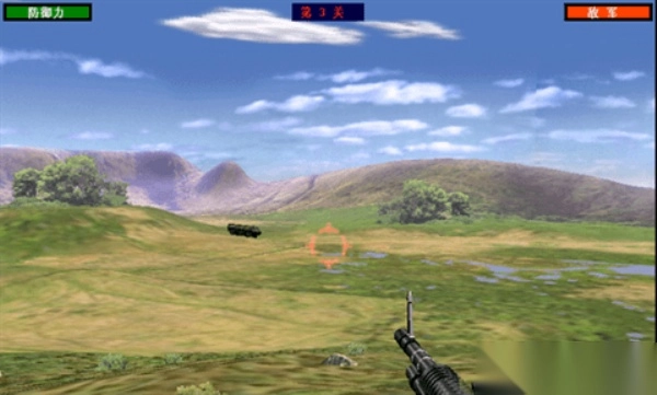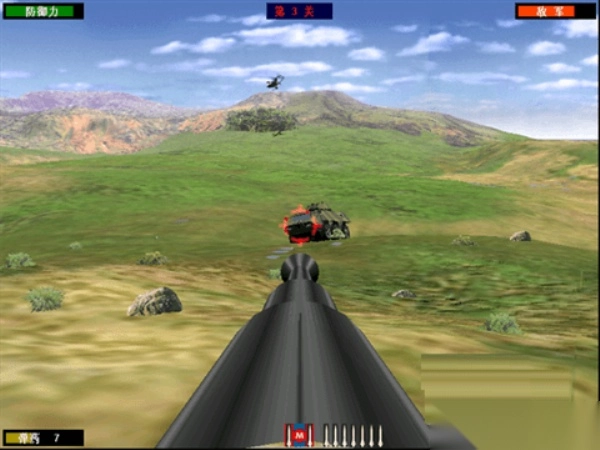 可攻击士兵、战斗机与直升机。当装甲运兵车的铁门开启时,将瞄准镜锁定门口,车内士兵会争先恐后地自动送死;若士兵已下车,需趁他们尚未散开之际,借助机枪的自身惯性进行扇面扫射;对付单个士兵时要注意节省子弹;消灭伞兵要分清轻重缓急(不过高处的目标本就不易击中),尤其要抓住机会补充给养;对付直升机尽量使用机关枪。