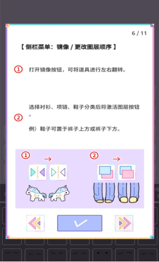侧栏菜单中,镜像按钮可实现道具的翻转操作,图层按钮则用于调整道具的层级关系。