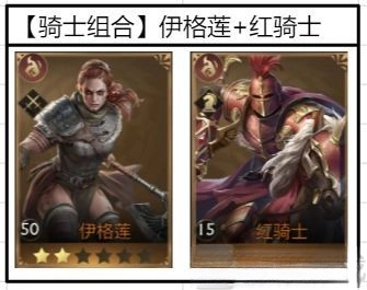 这是伊格莲与红骑士的搭配,属于黄金英雄里较早能在PVP中使用的组合。他们的共鸣类型均为勇武,红骑士可增强骑兵小范围的伤害效果,伊格莲则直接提升骑兵伤害。而且由于二者共鸣类型一致,由他们带队时,骑兵的防御、血量等属性都会得到提高。